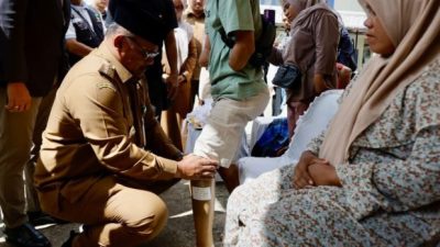 Banda Aceh – Penjabat Gubernur Aceh, Dr. H. Safrizal ZA, M.Si, memasangkan kaki palsu kepada…